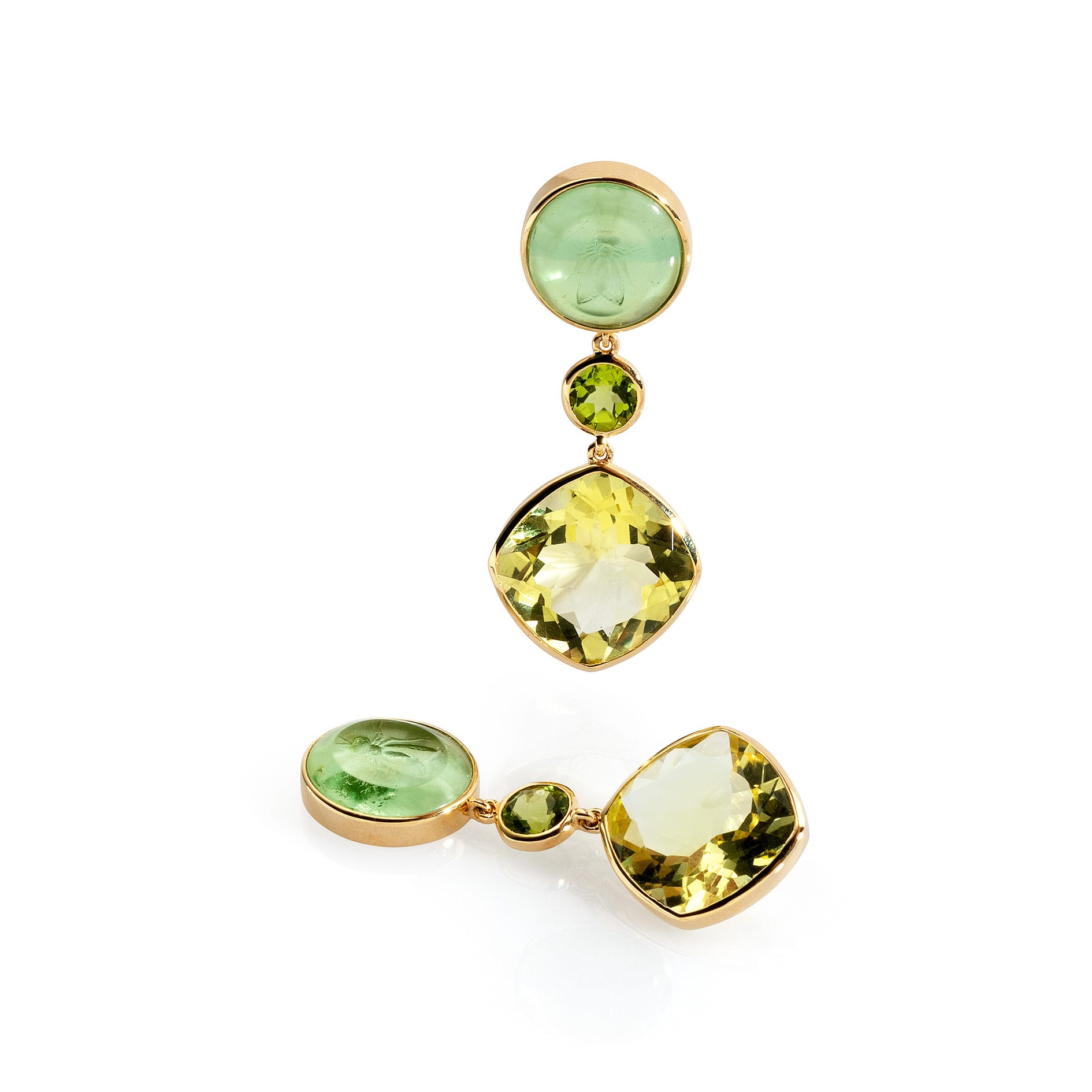 with green Venetian glass cameo with mother-of-pearl backing, peridot and lemon quartz, length: 4.5cm/1.8″