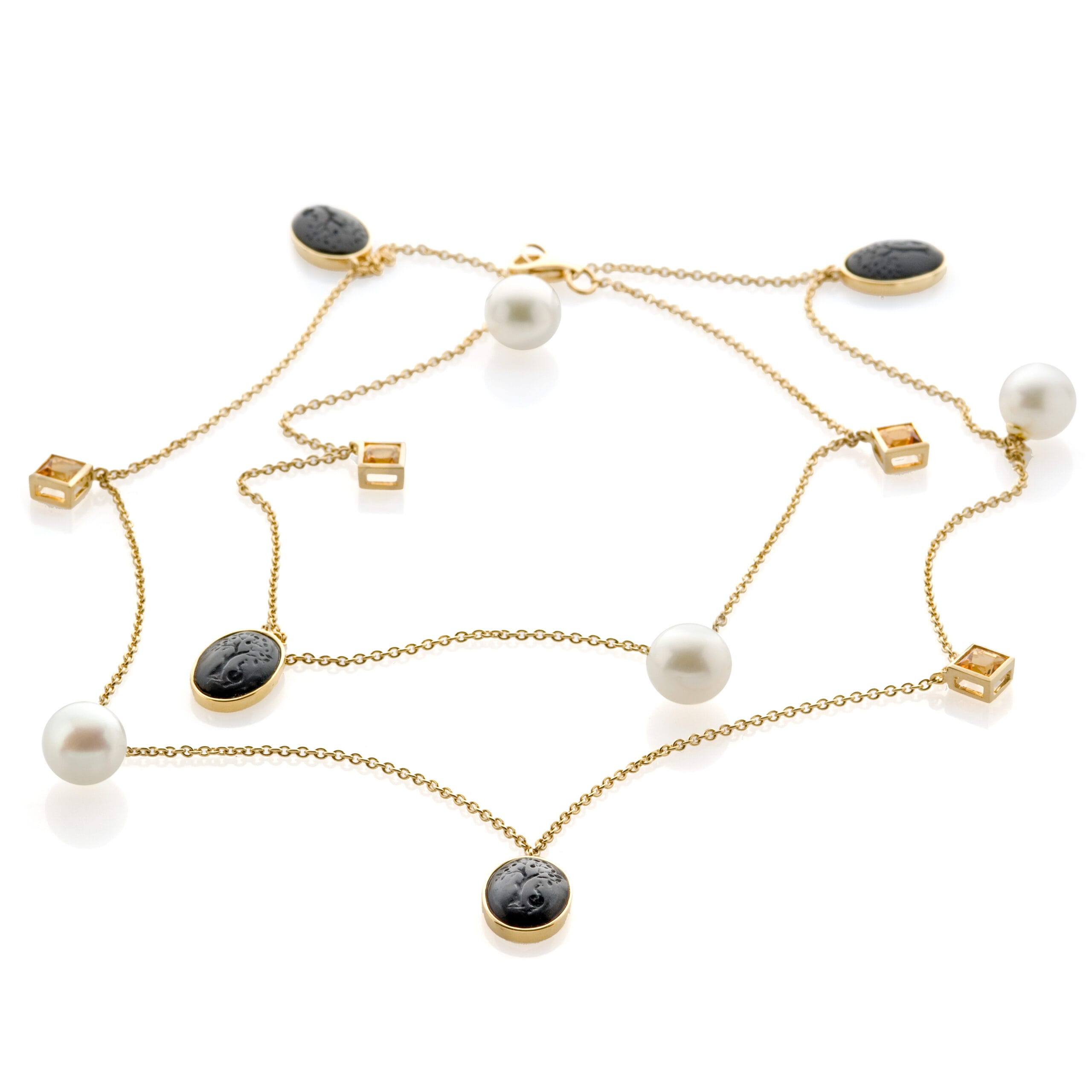 with pearls, citrines and black Venetian glass cameo, length: 80cm/31.2″ (NKNo110)