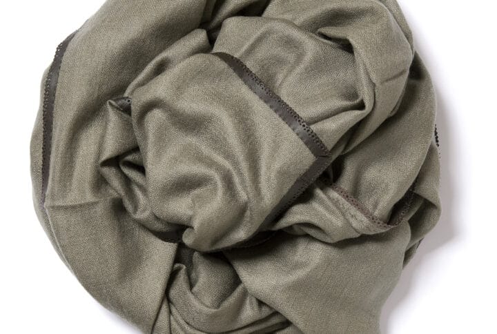 with olive green-black changeant silk chiffon attached on one side of the scarf, size: 1x2m