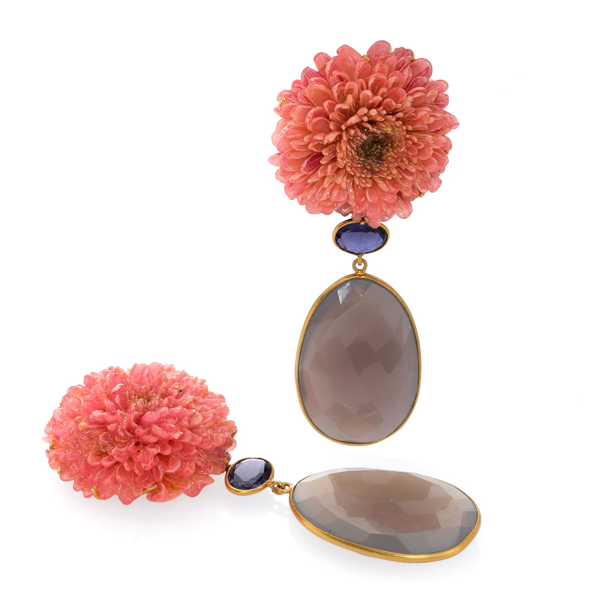 avec dahlia véritable, iolite et quartz gris, longueur: 7cm/2.8″