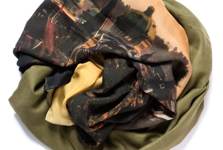 avec soie chiffonnée imprimée (Venice) et cousue sur un côté de l’écharpe, mesure: 1x2m