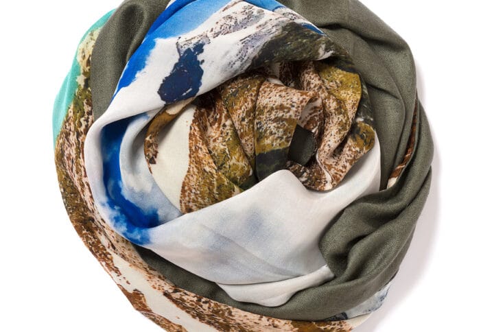 avec soie chiffonnée imprimée et cousue sur un côté de l’écharpe, mesure: 1x2m