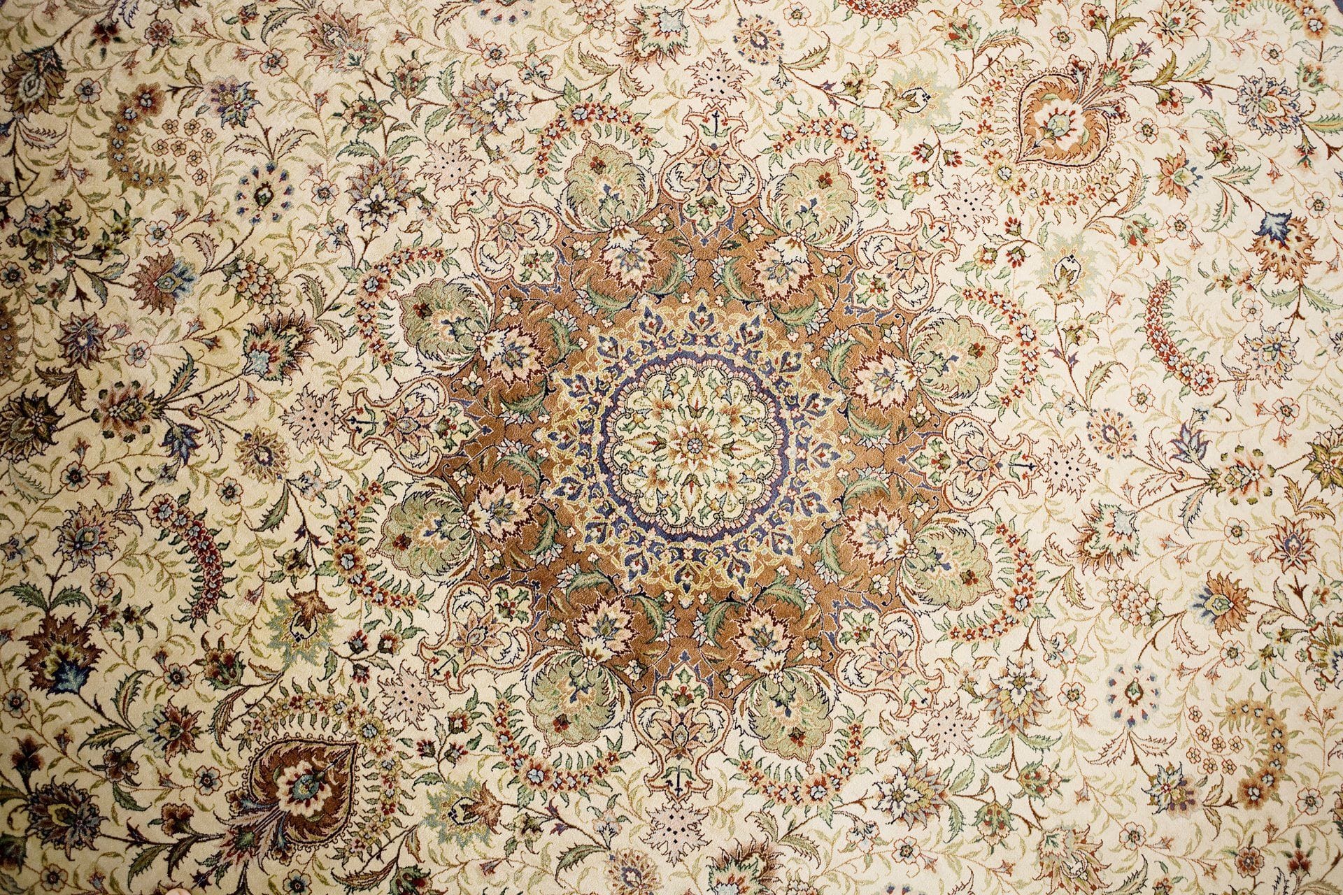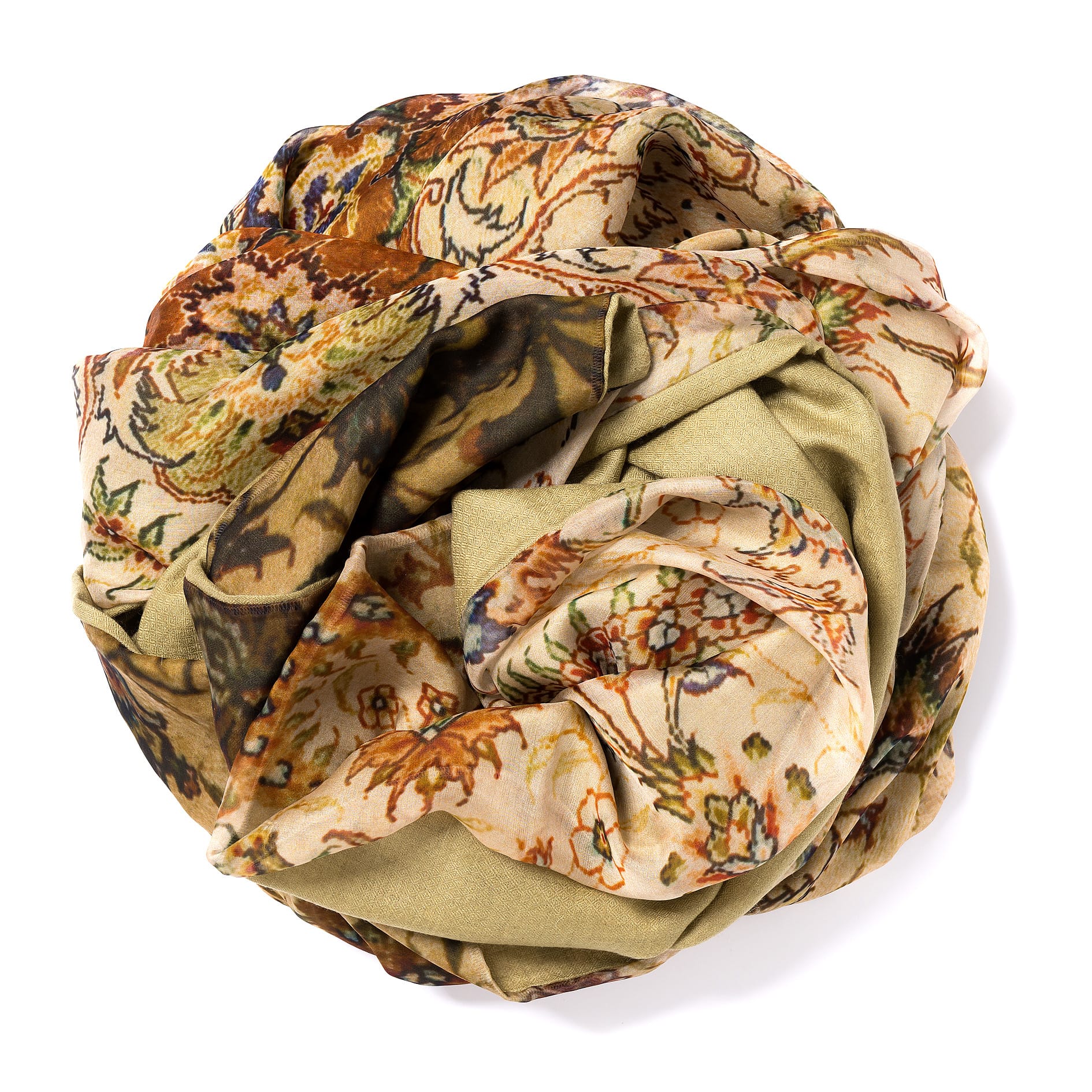 avec soie chiffonnée imprimée (vieux tapis) et cousue sur un côté de l’écharpe, mesure: 1x2m