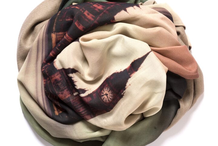 avec soie chiffonnée imprimée (Berne) et cousue sur un côté de l’écharpe, mesure: 1x2m