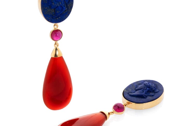 mit hellblauem Kamee aus venezianischem Glas, Perlmutterplättchen, Amethyst und Bergkristall, Länge: 6cm/ 2.4″