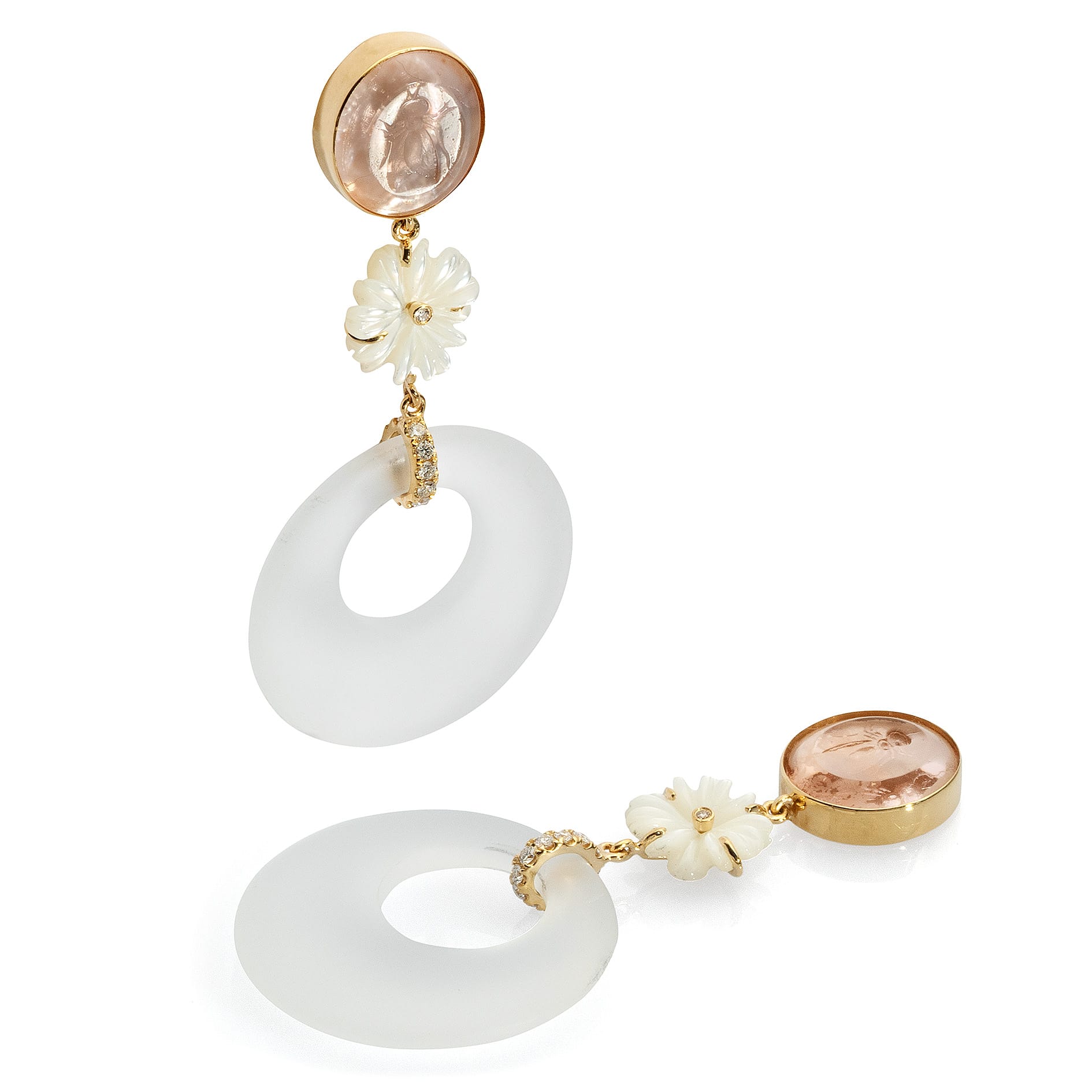 mit lachsfarbenem Kamee aus venezianischem Glas und Perlmutterplättchen, Perlmutterblume, Diamanten und Bergkristall, Länge: 6.5cm/2.6″