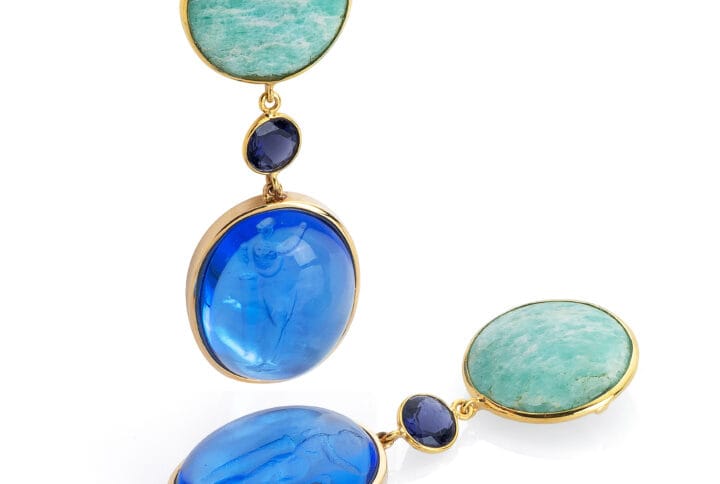 mit Bergkristall, weissen Kamees aus venezianischem Glas und Perlmutterplättchen, Länge: 92cm/36.8″